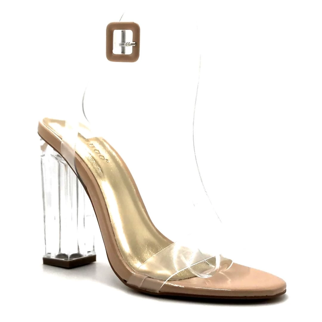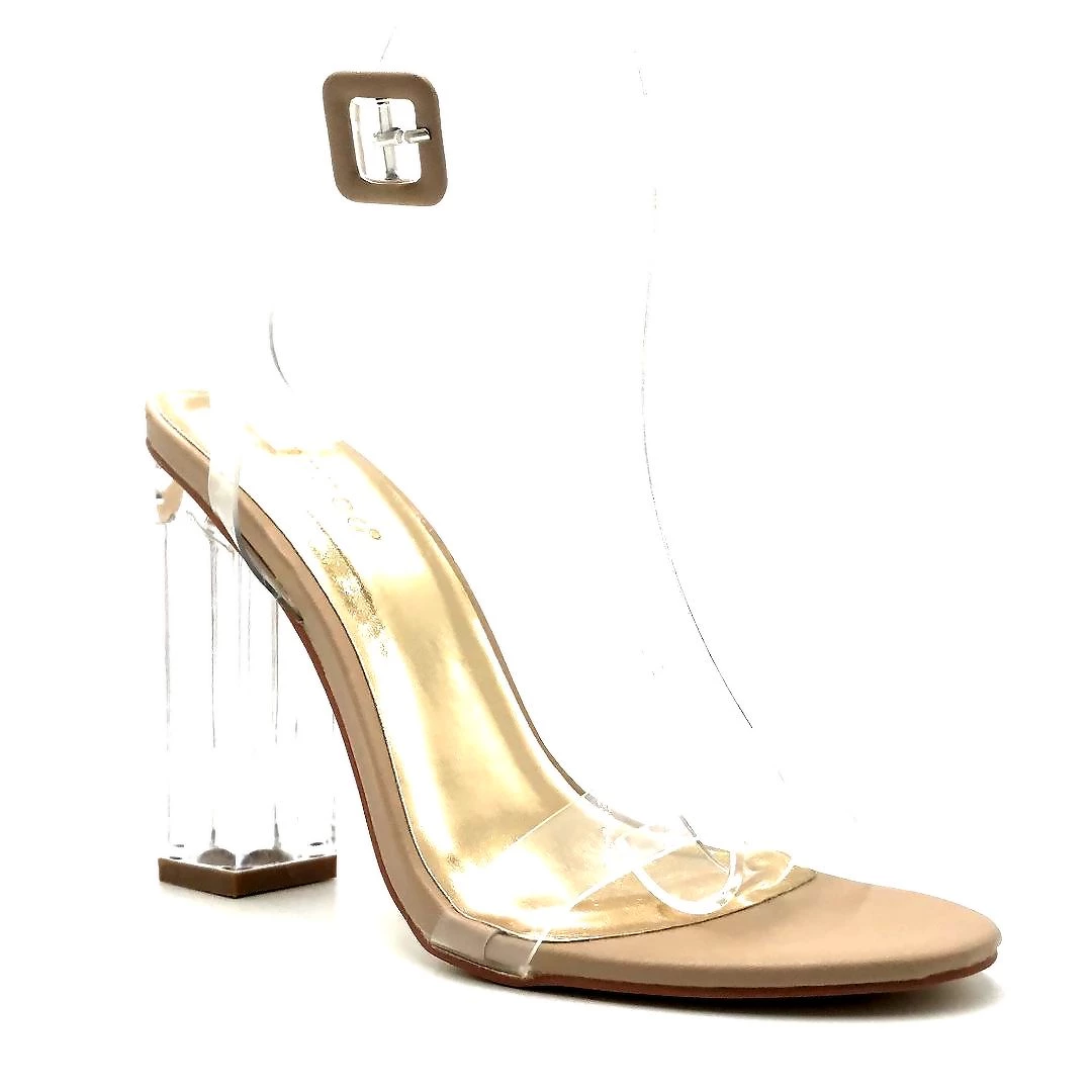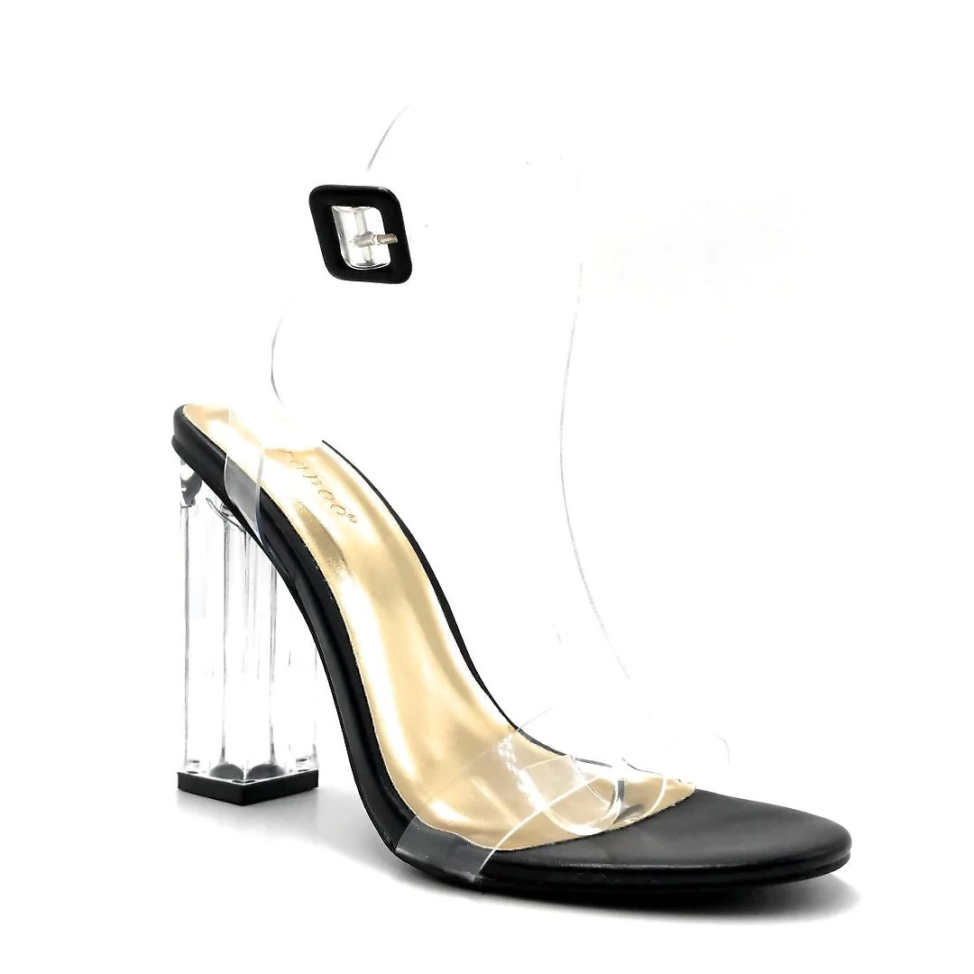 - Class in a glass these chunky heels are the perfect go to featuring an open toe silhouette, soft pvc strapped upper, a transparent block heel, light cushioned insole, and an adjustable buckle ankle strap closure.
