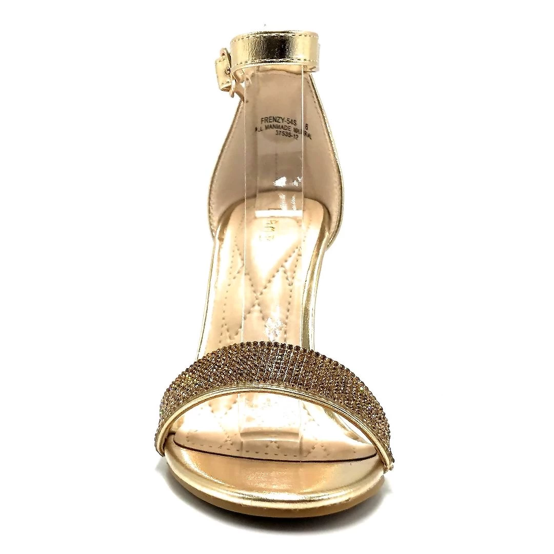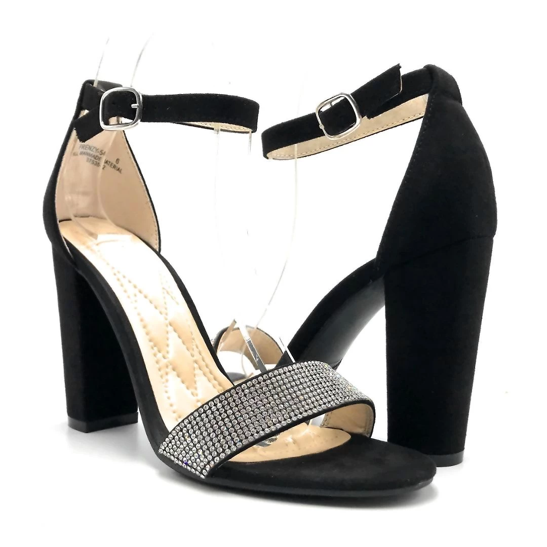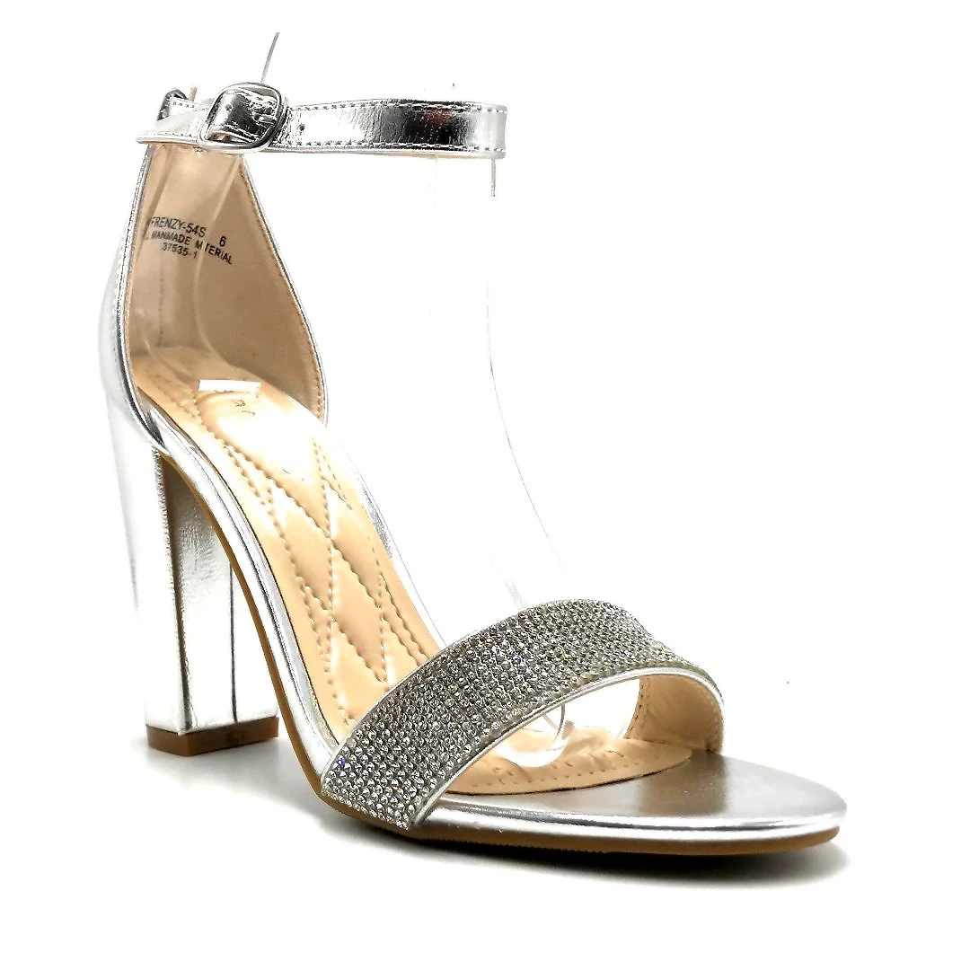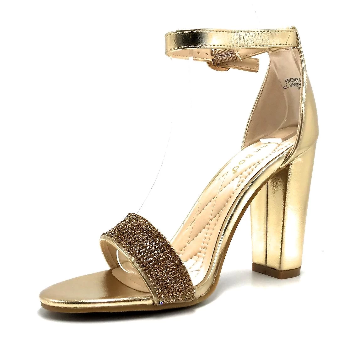 - These metallic open toe heels features a single sole design, single rhinestone embellished band vamp, and adjustable buckle ankle straps.