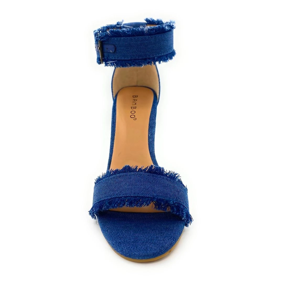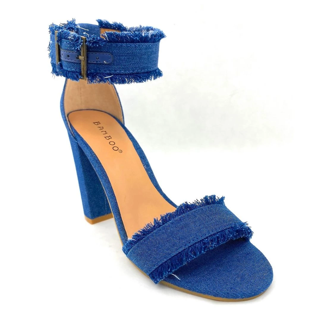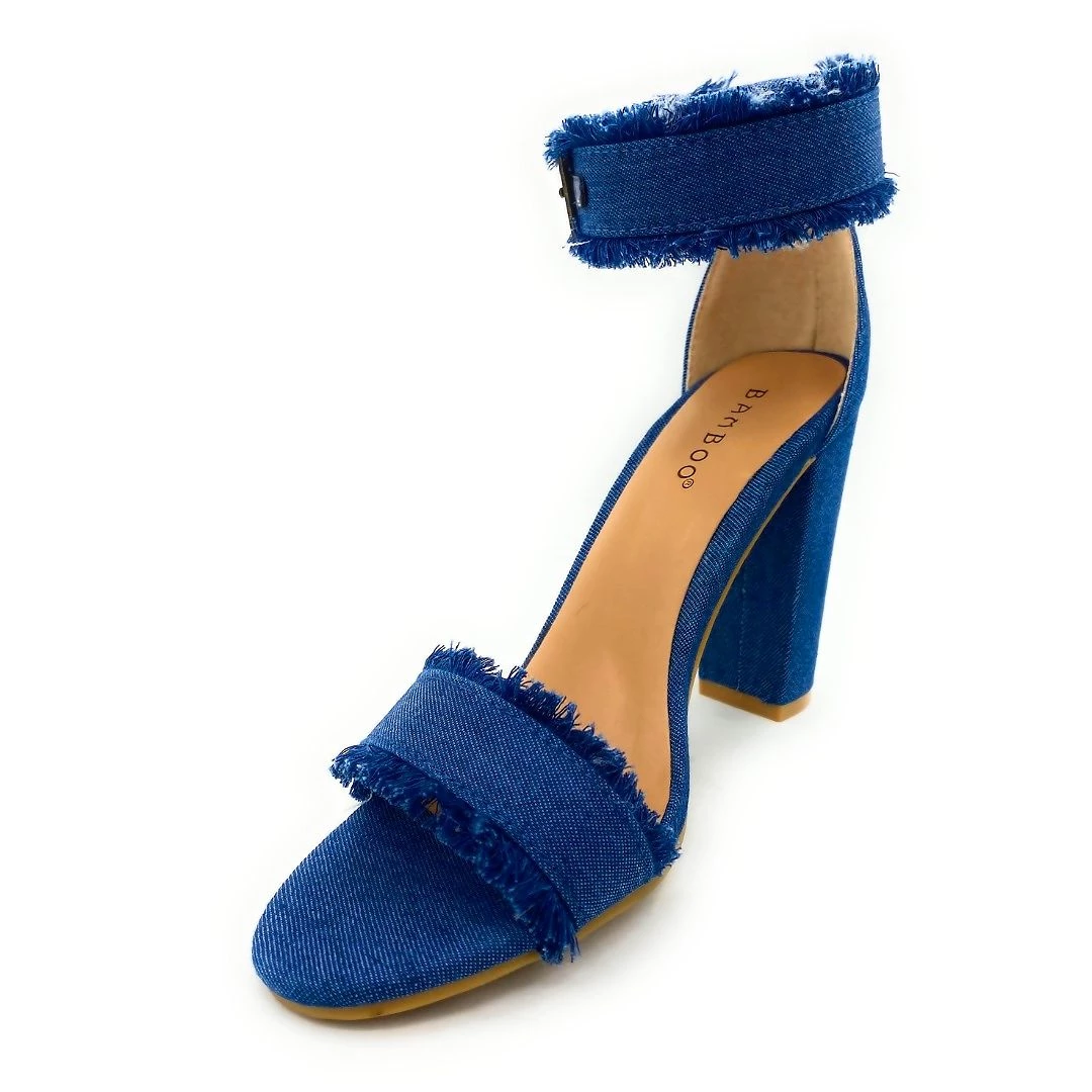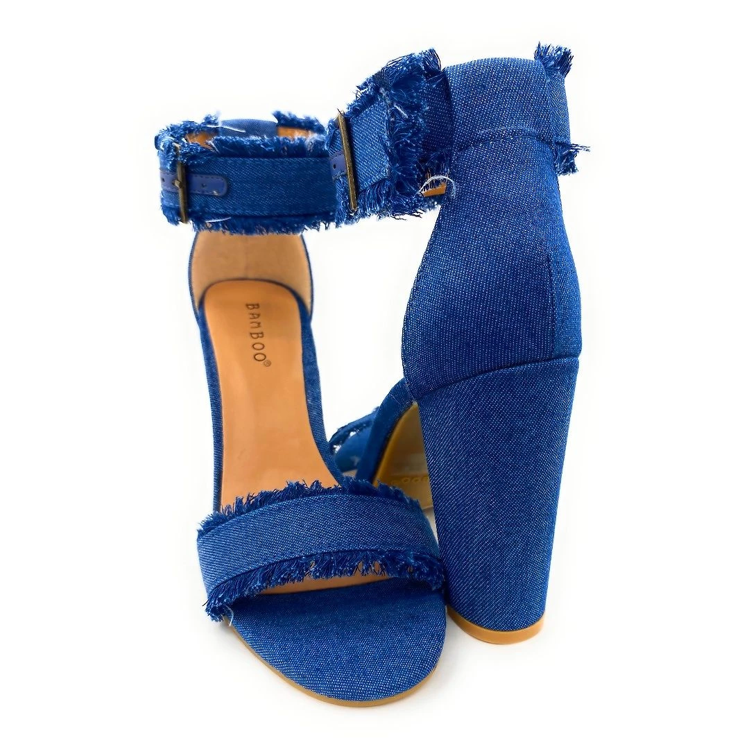 - This pair features a black denim material, adjustable ankle strap, Chunky Heels, singles soles, and cushioned insoles.