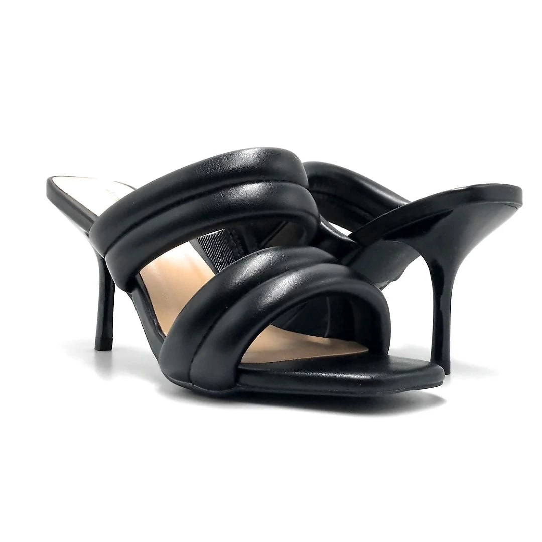 - These dress sandal features a double padded puffy strap, thin high heel stilettos, slide in construction and open squared toe. The in sole is lightly padded and the pillow like padded strap also has a small elastic for better fitting.