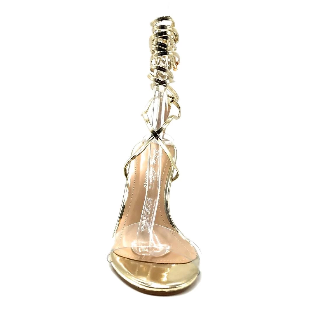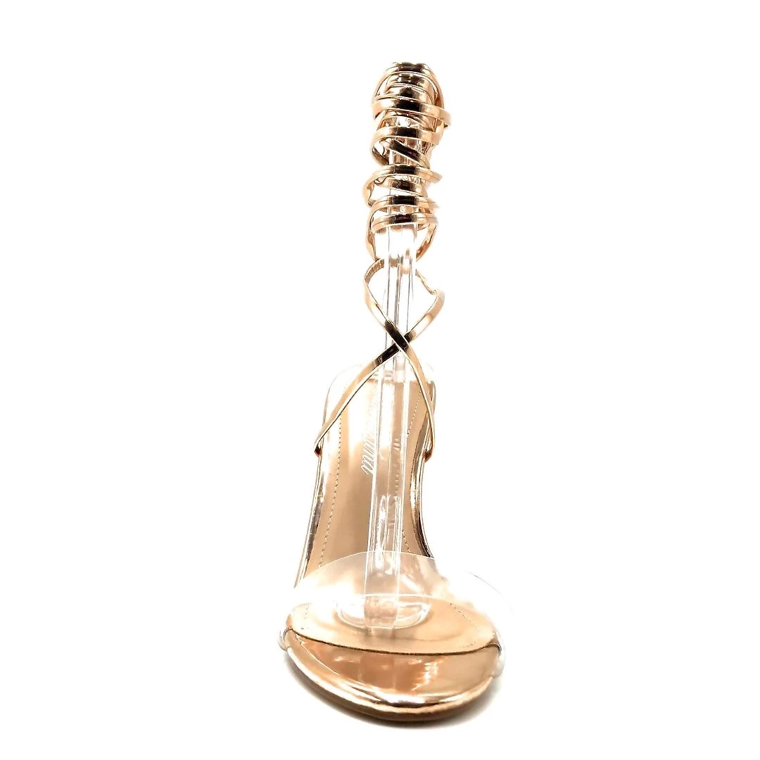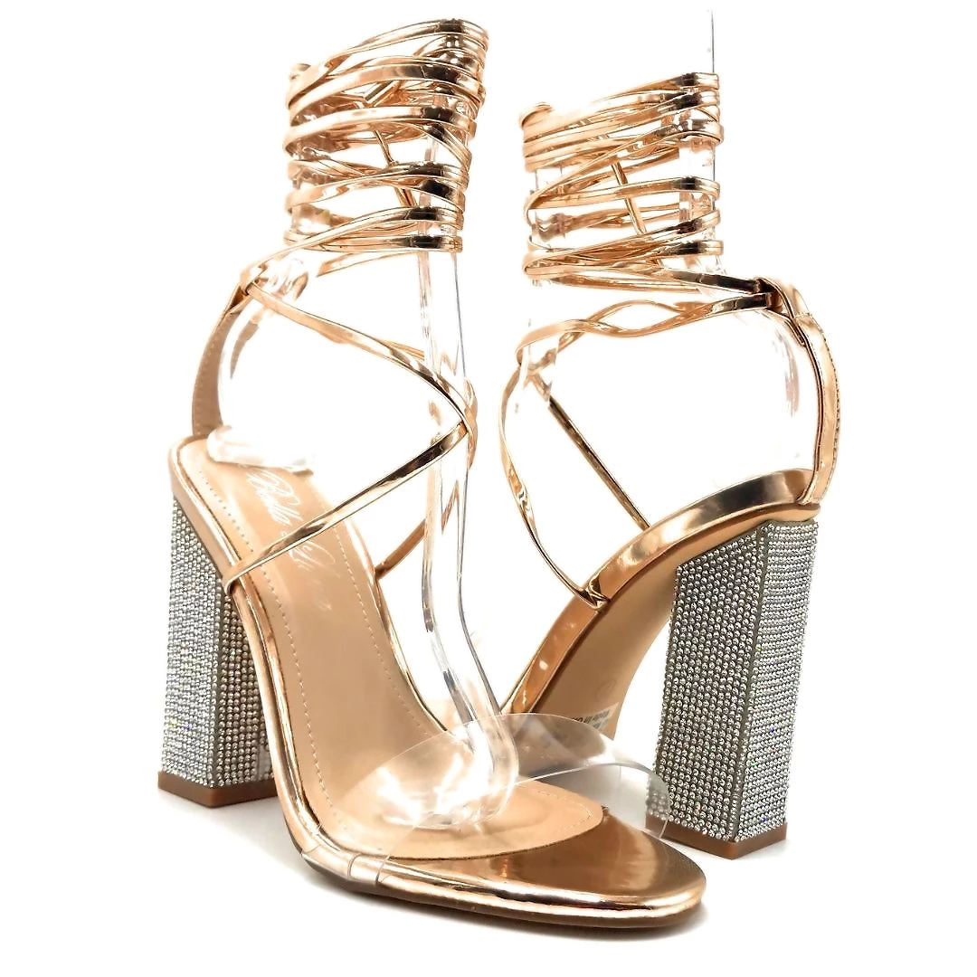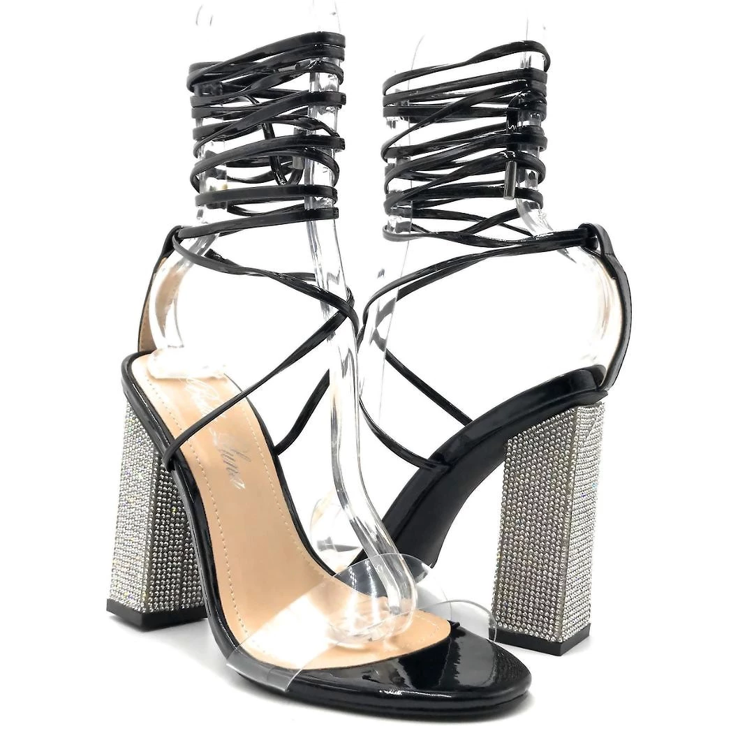 - These trendy clear high heel sandals are made to impress! Featured with rhinestone, clear PVC material. Made with an open toe, ankle strap Criss cross style, and chunky block heel. Suitable for many occasion, such as wedding party working. These gladiator transparent heeled sandals is a must-have for your home wardrobe, and can be given as great gifts due to their comfortable and fashionable.