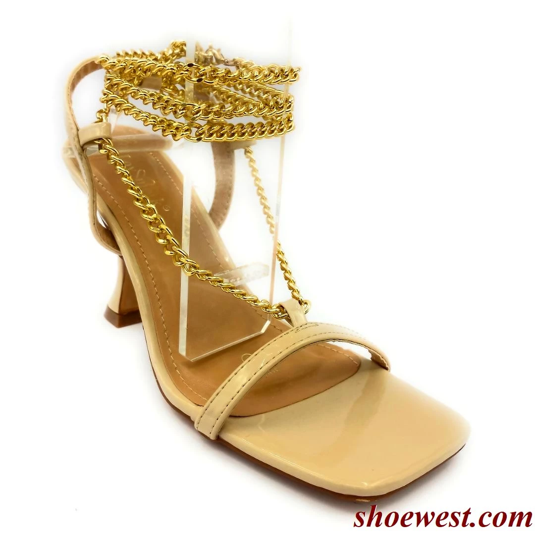 - This Heeled Sandal Featuring Wrap Tie-up Chain with Toe post Detail.