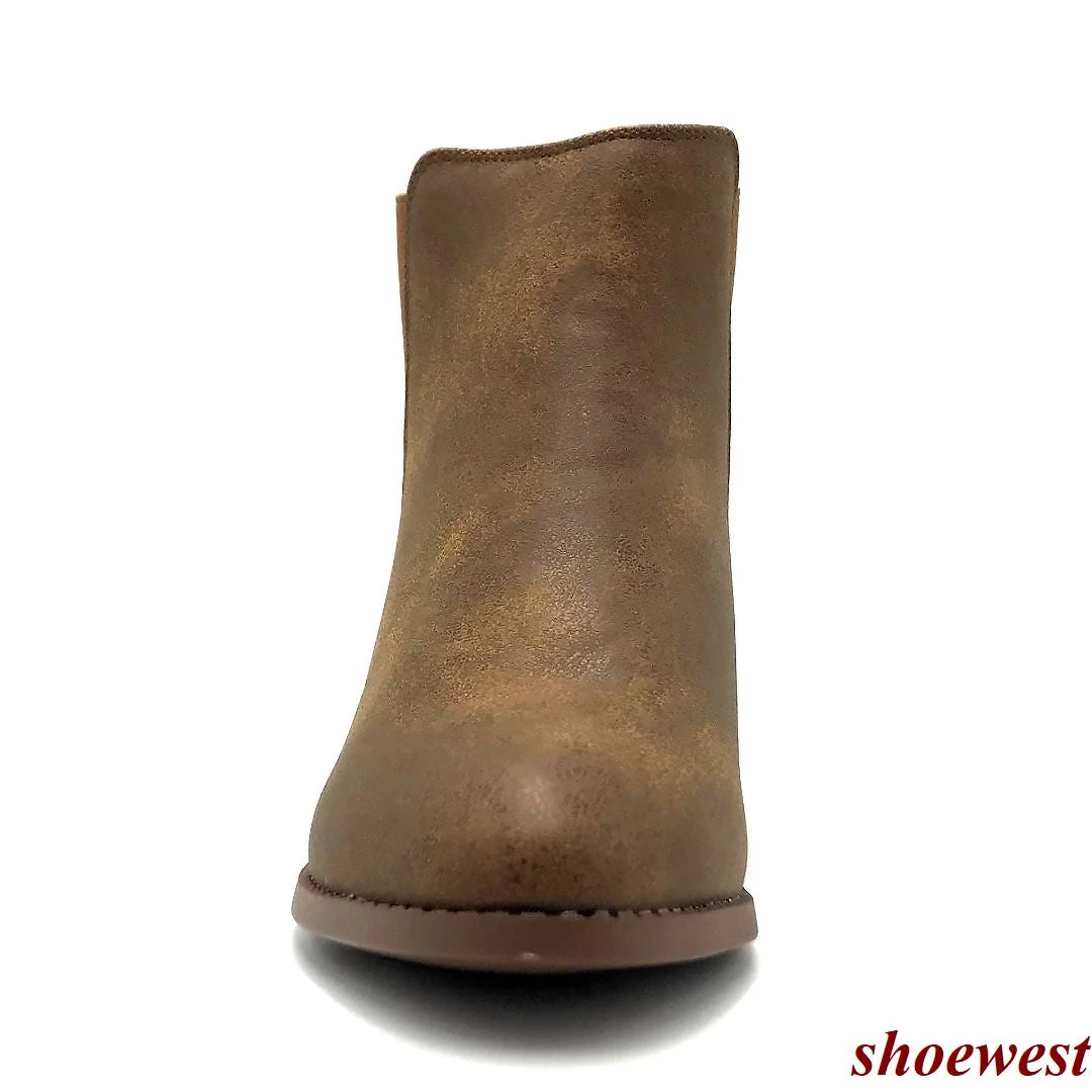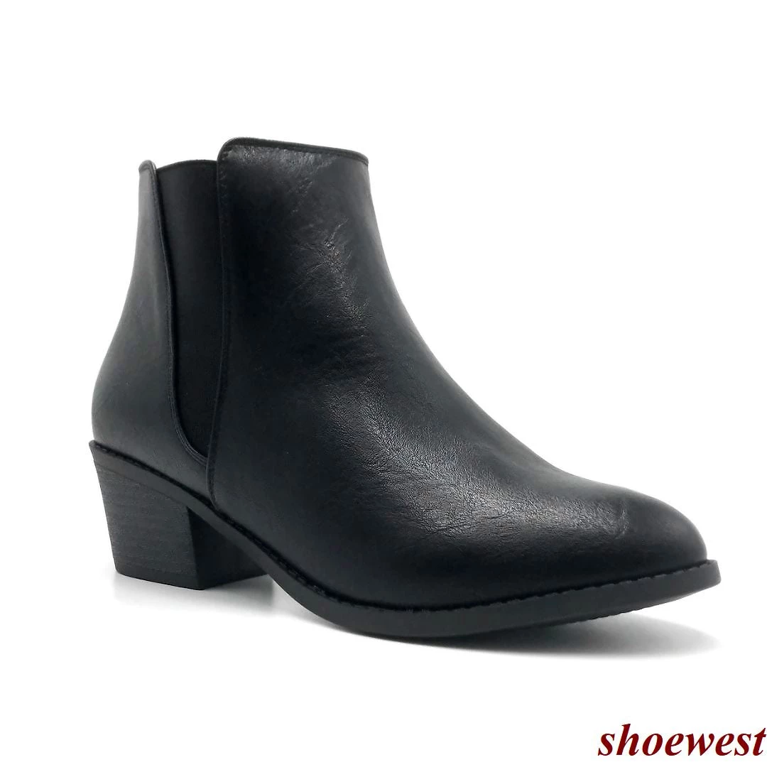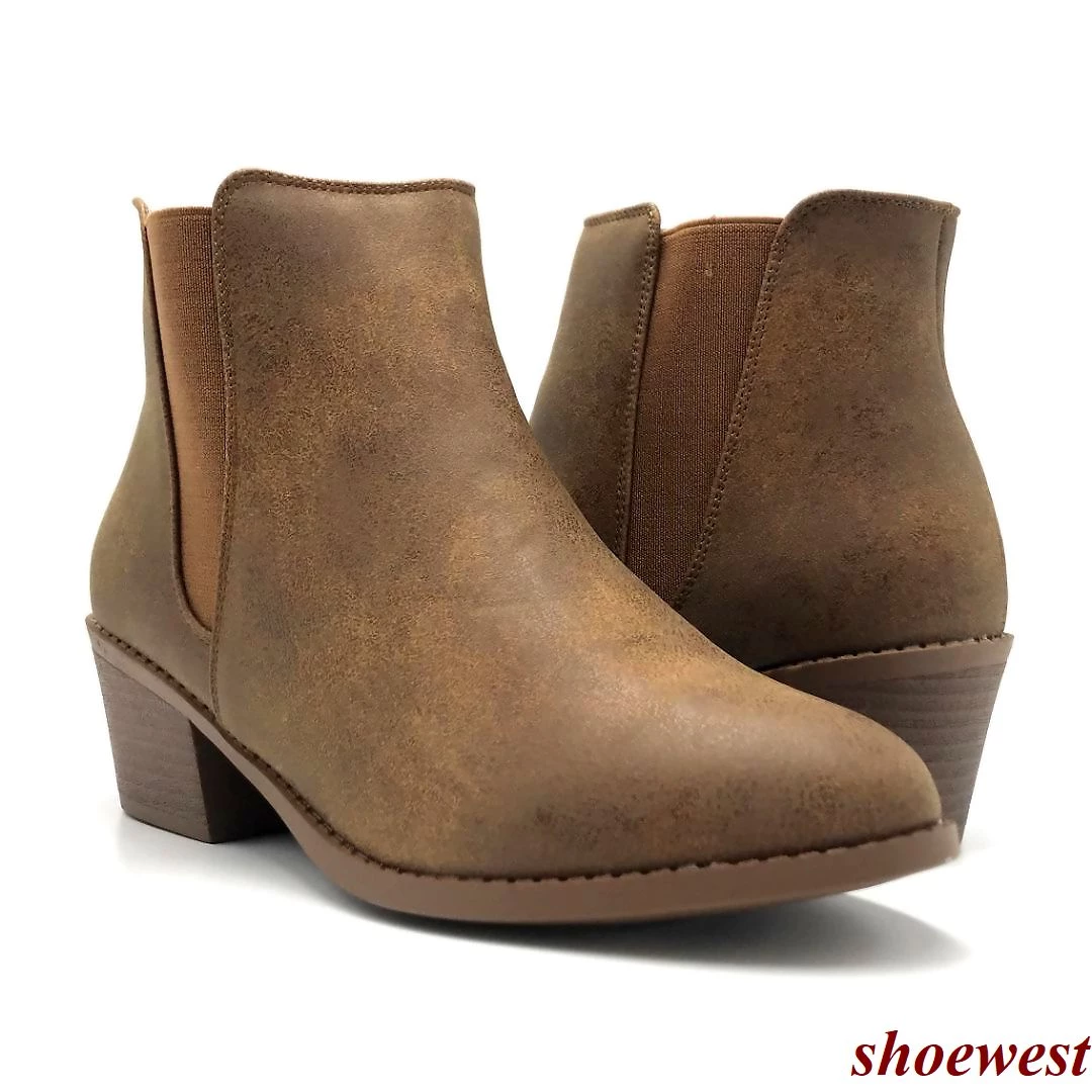 - Round-toe pull-on booties with side goring