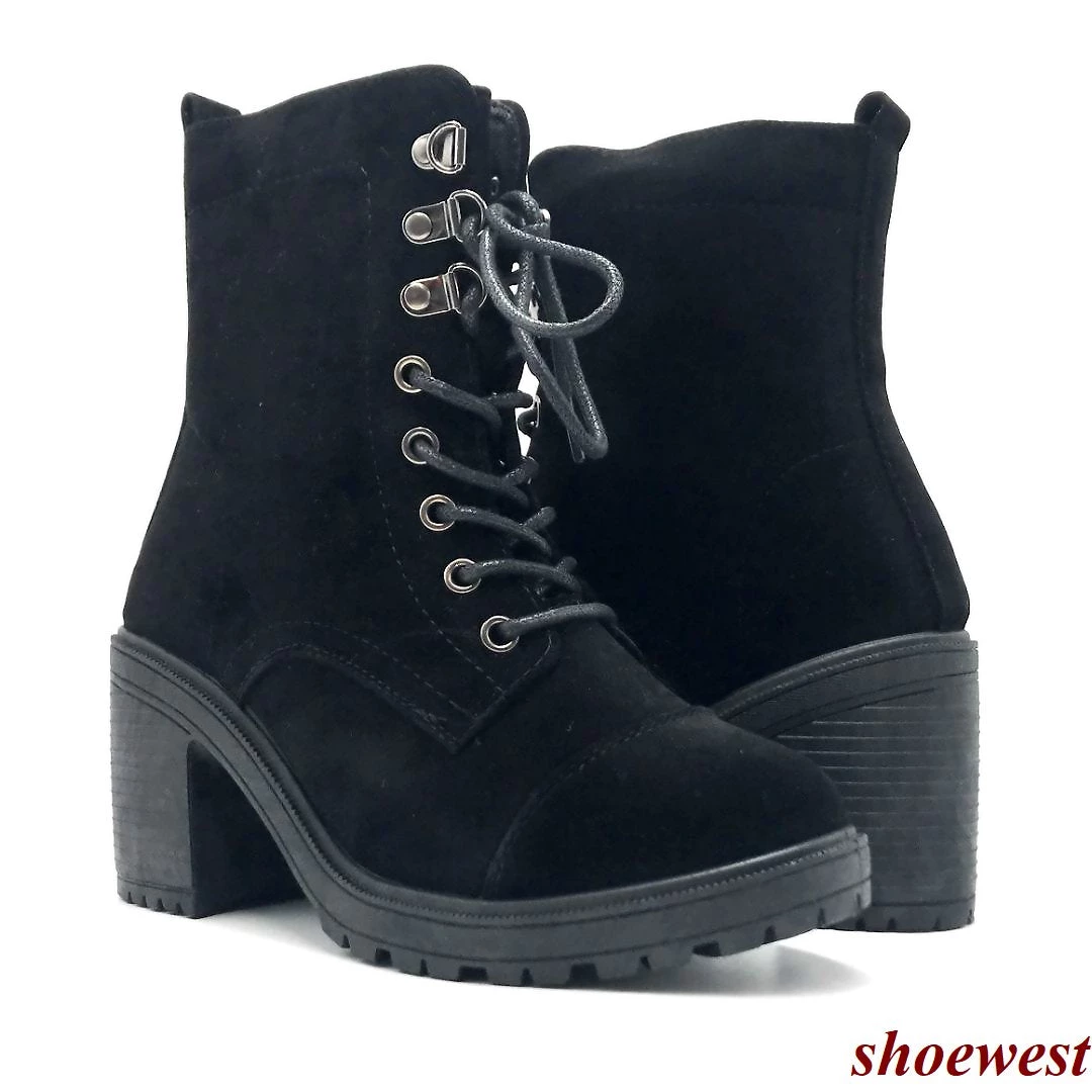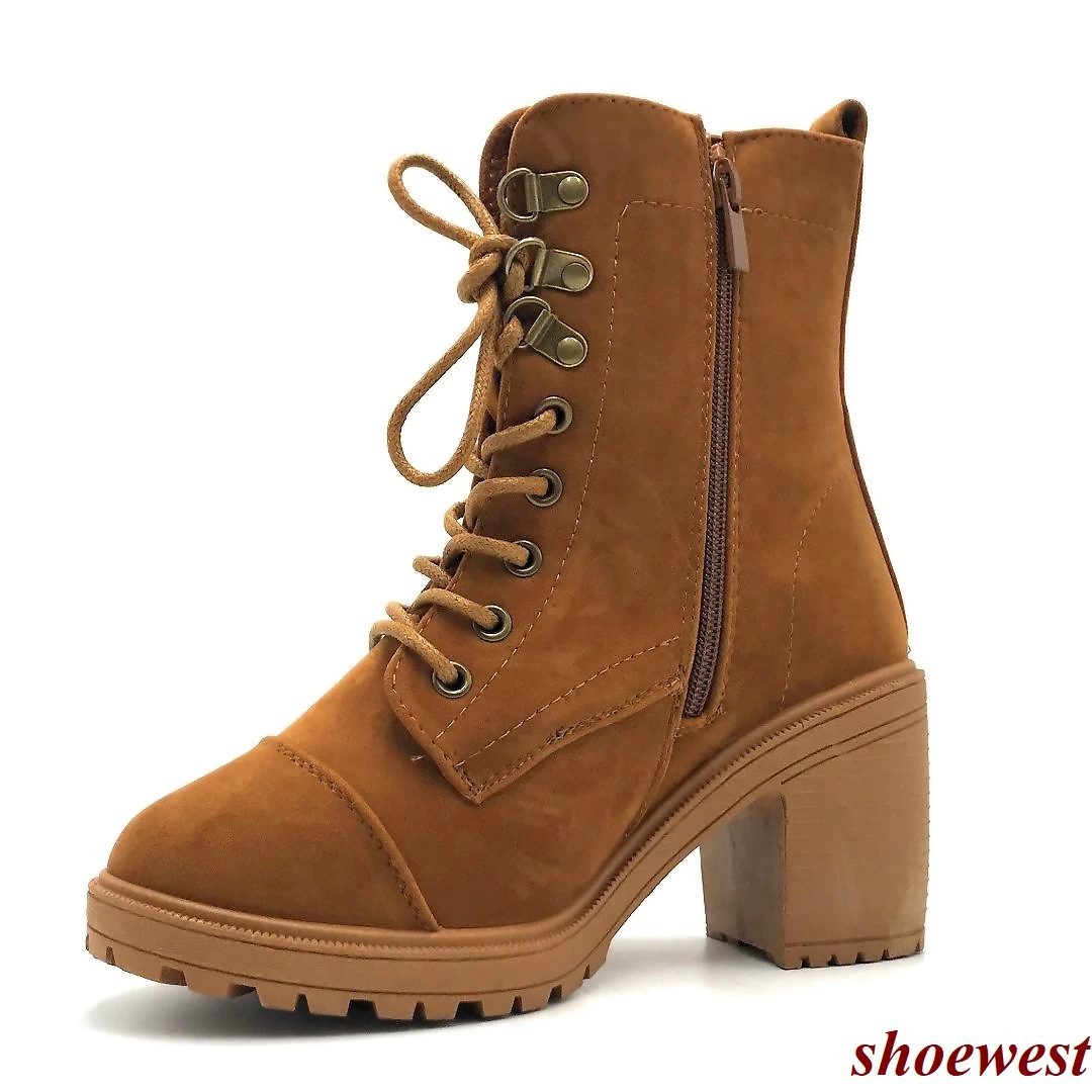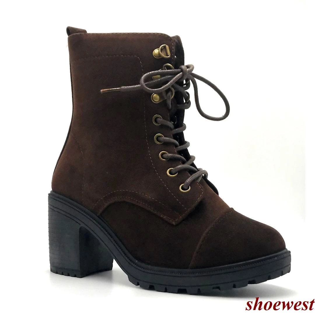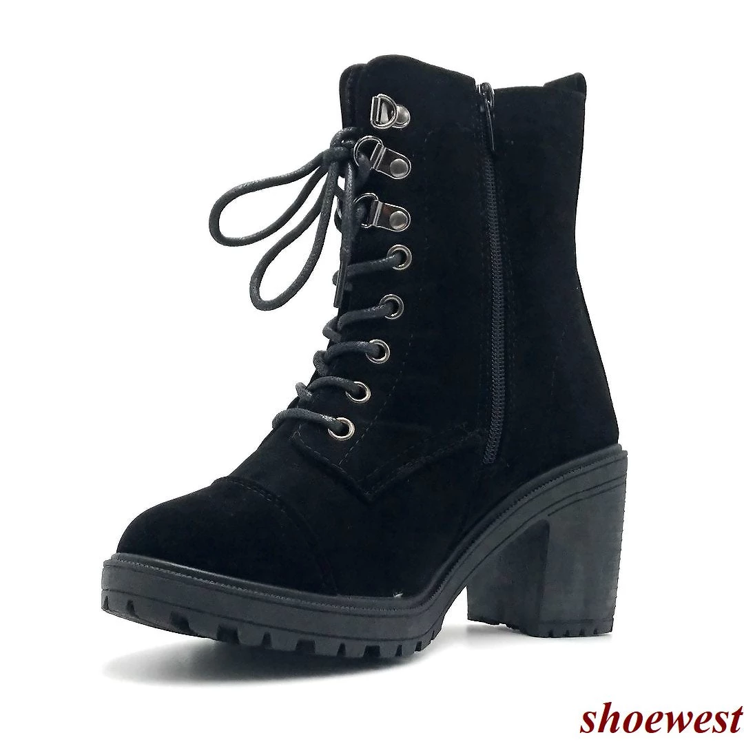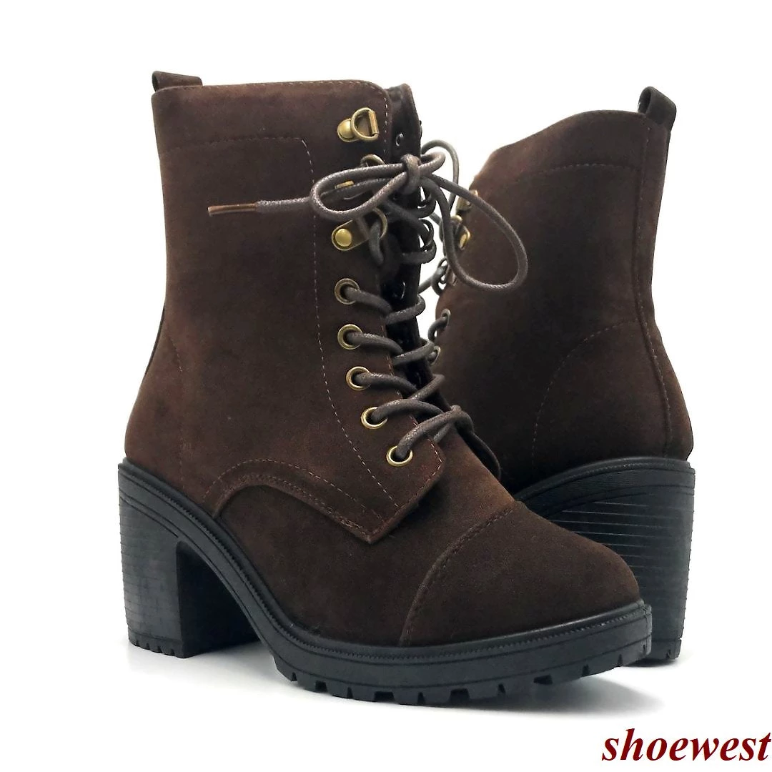 - Design with leather suede upper, almond toe, lace up front, stitch detail, platform lug sole, chunky heel and zipper closure.