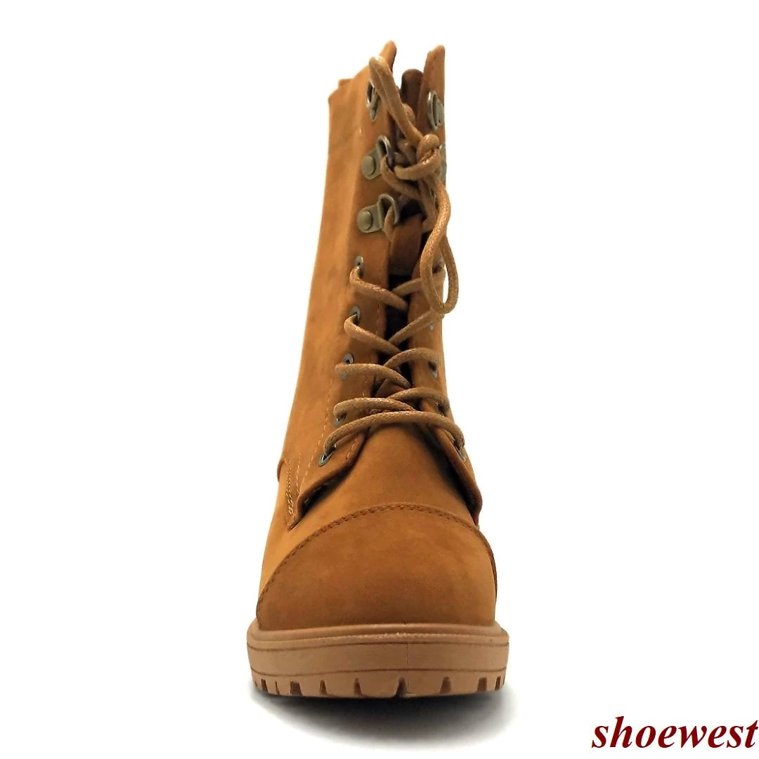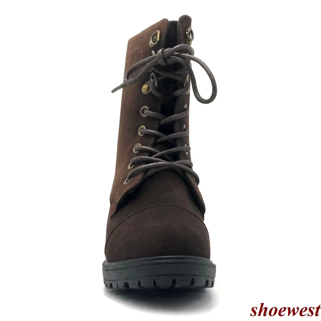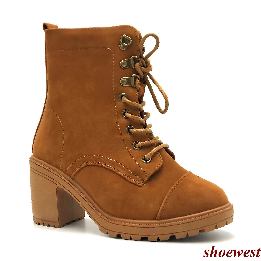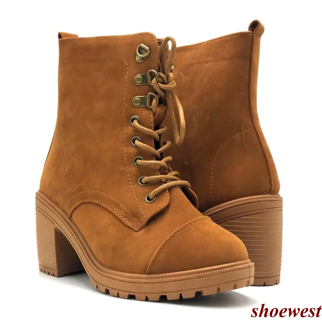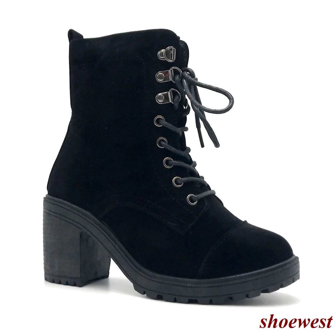 - Design with leather suede upper, almond toe, lace up front, stitch detail, platform lug sole, chunky heel and zipper closure.