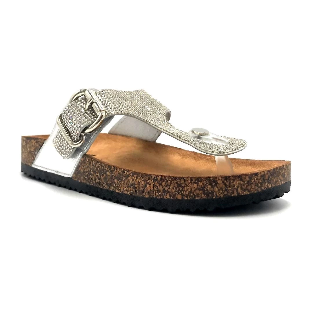 - These sandals features a cork molded foot bed , shimmering rhinestone crystal embellishments, slide in construction, adjustable strap, thong strap, vintage stain on the insole.