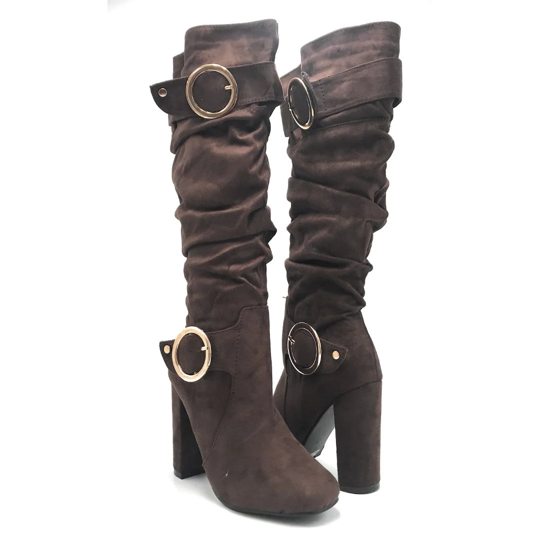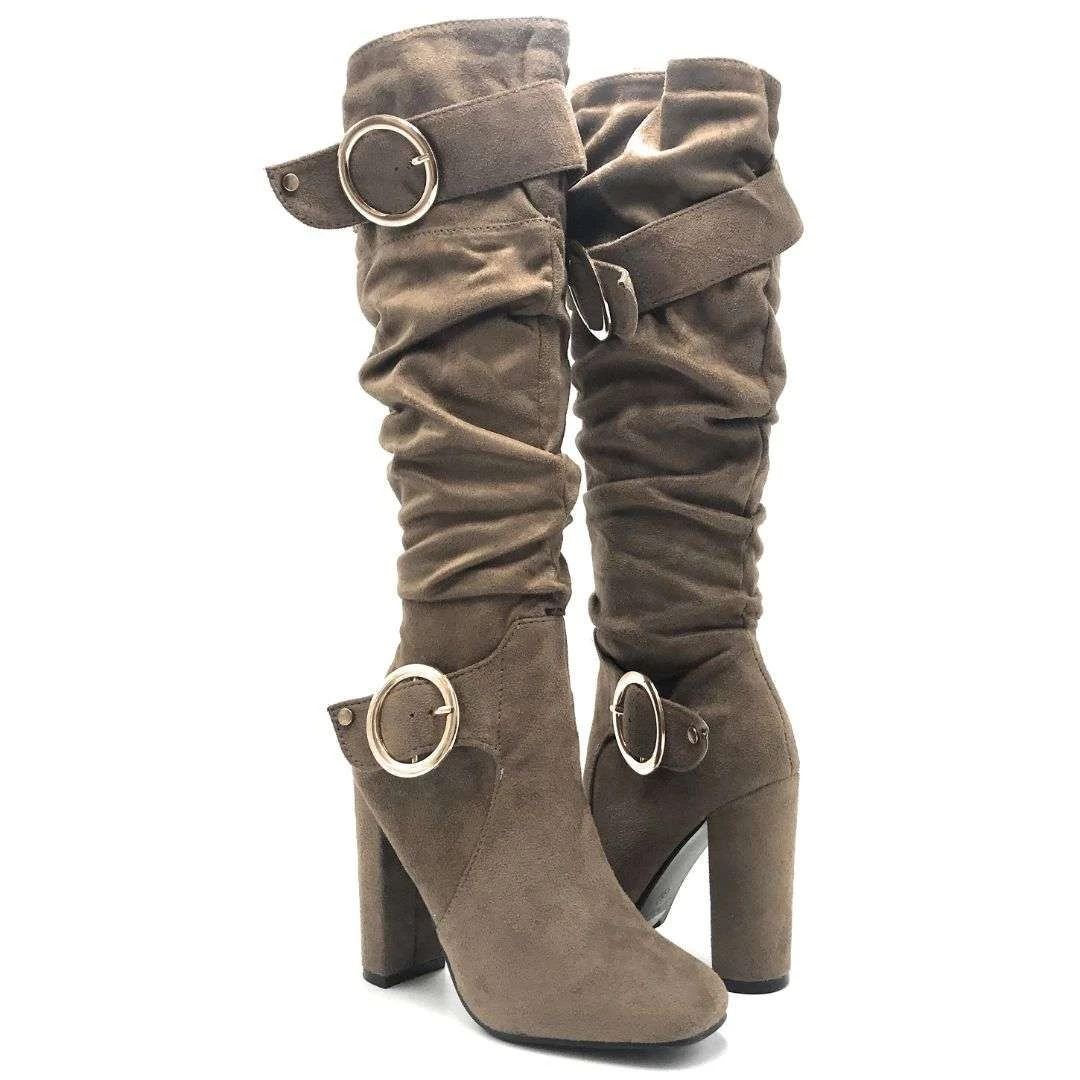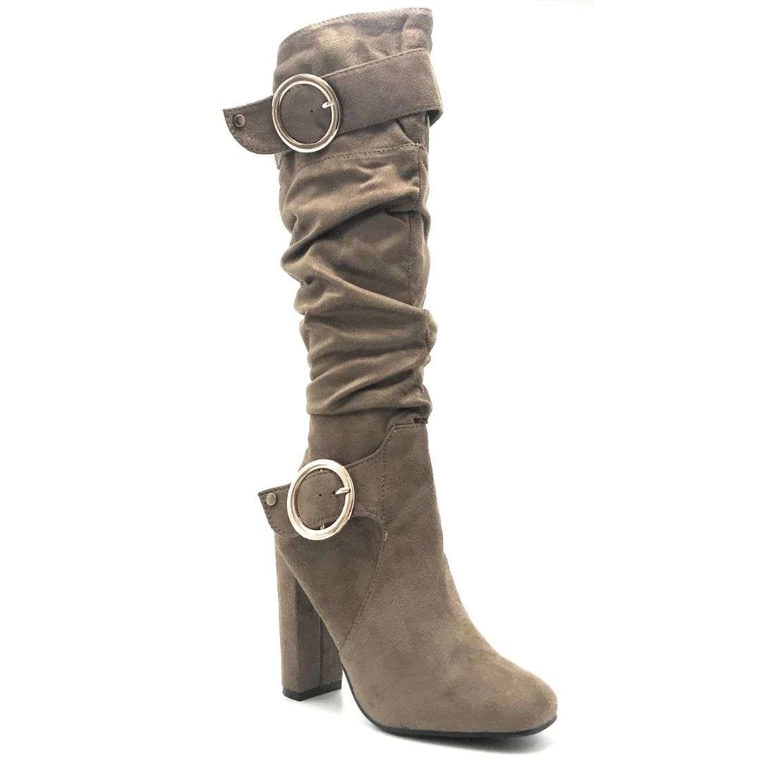Forever Women’s Faux Suede Square-Toe Knee High Buckle strap High Block Heel Dress Boots