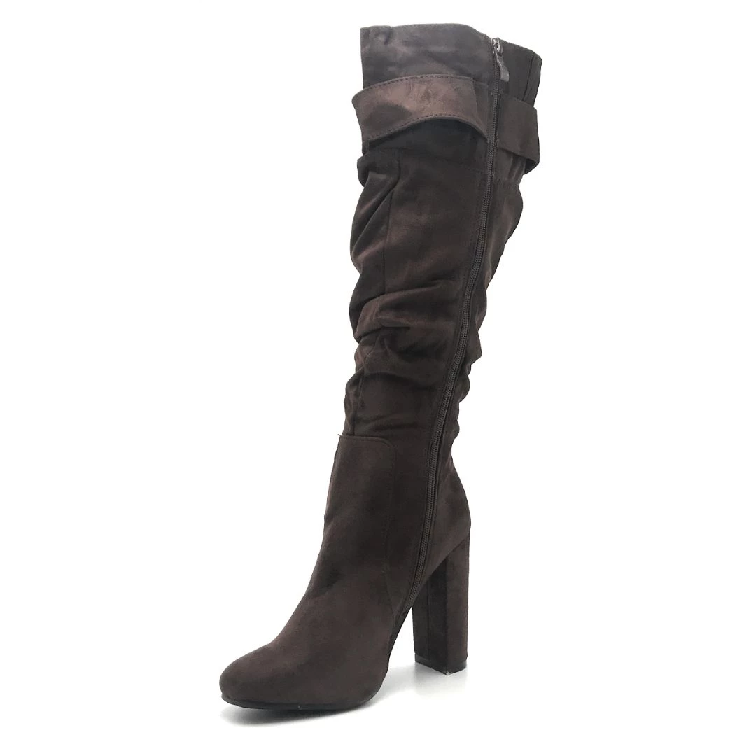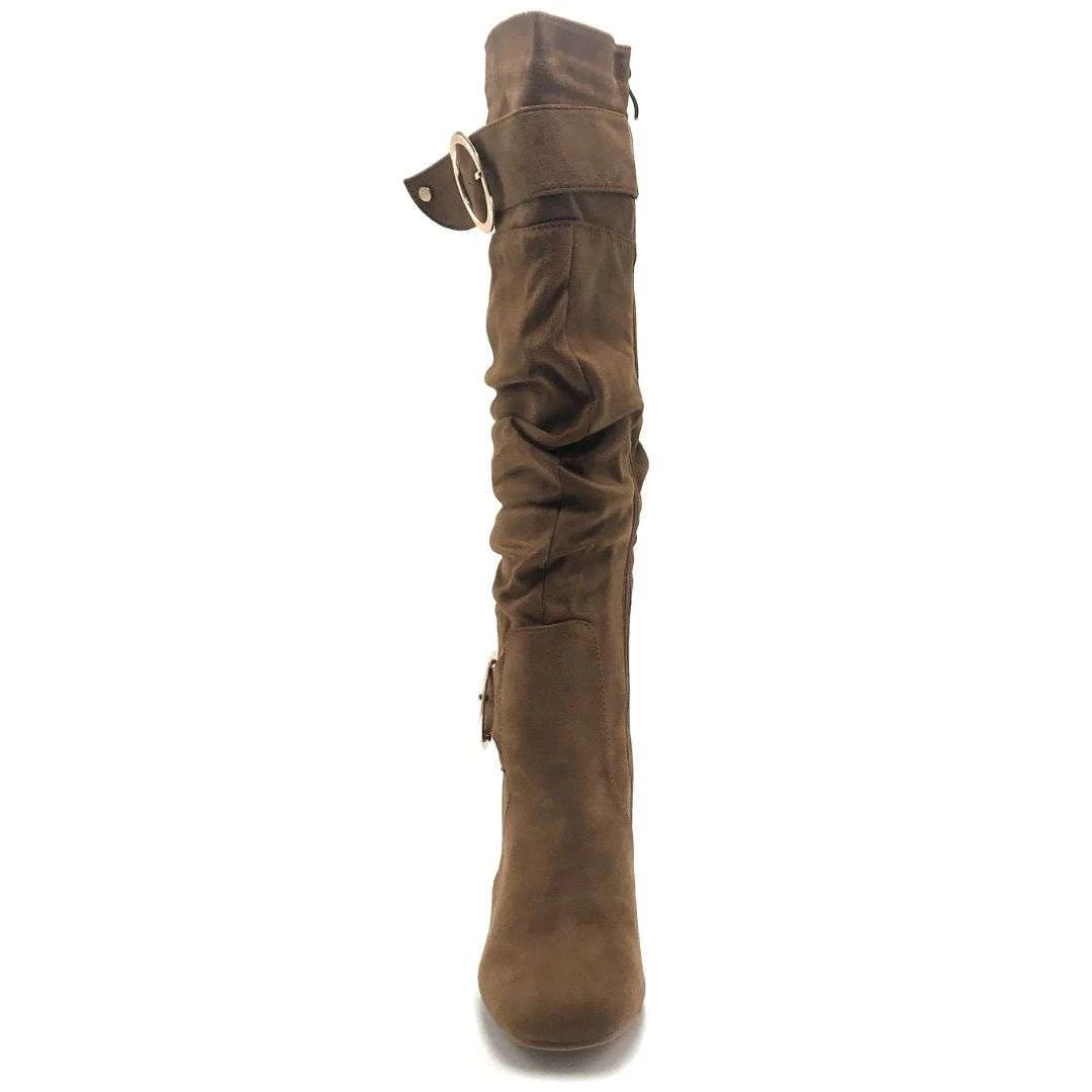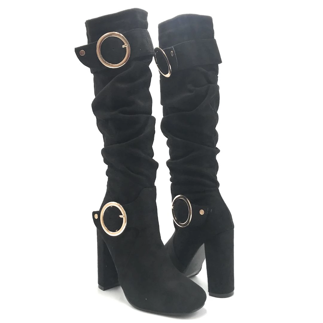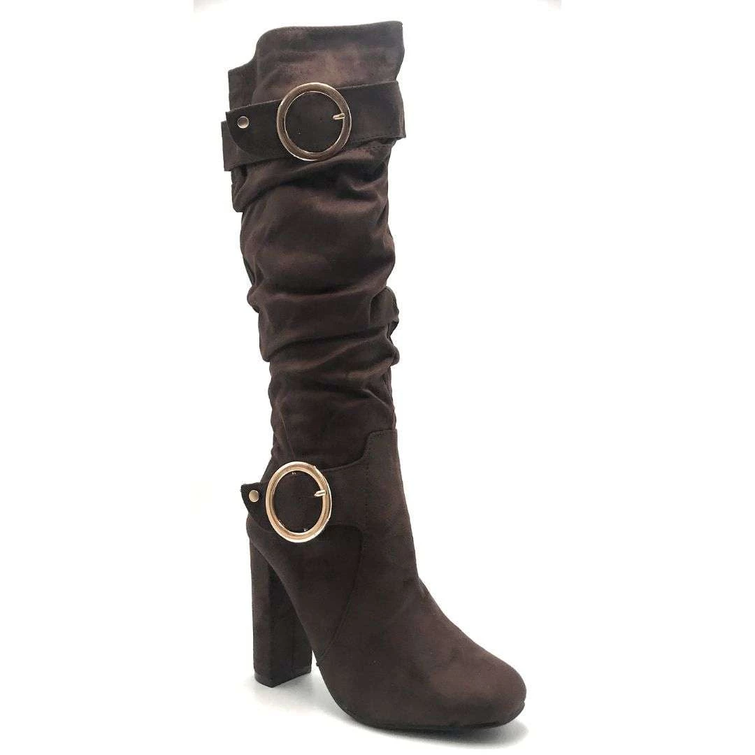 Forever Women’s Faux Suede Square-Toe Knee High Buckle strap High Block Heel Dress Boots