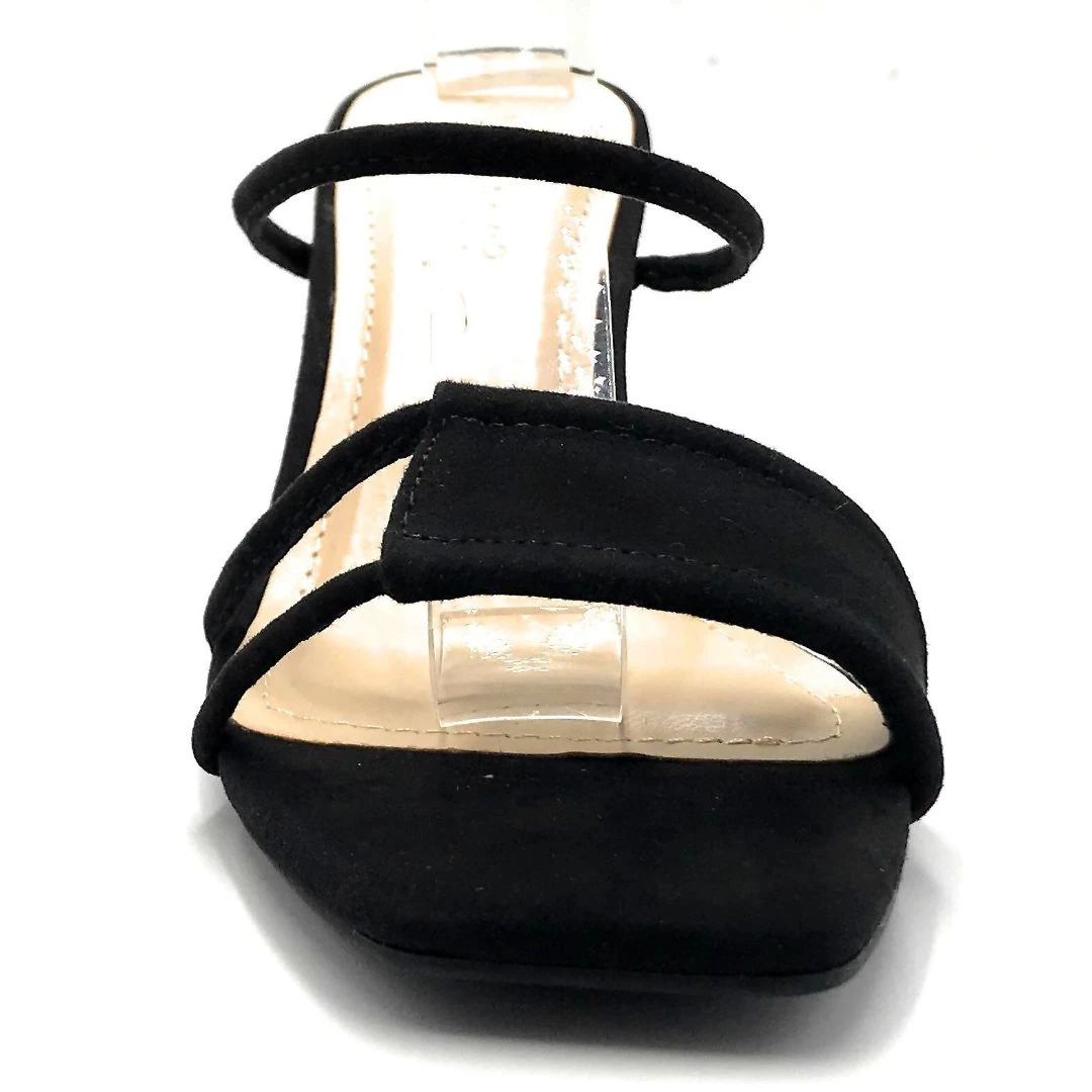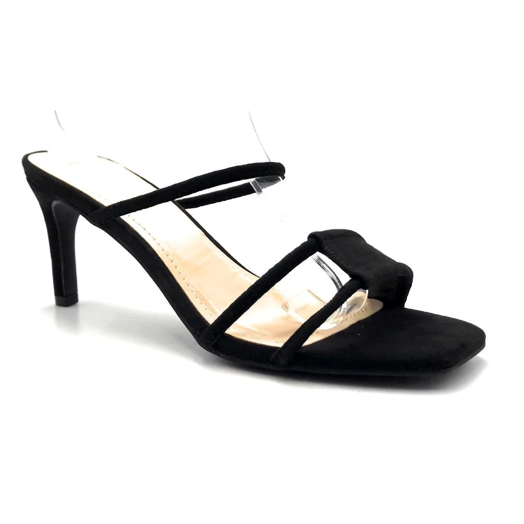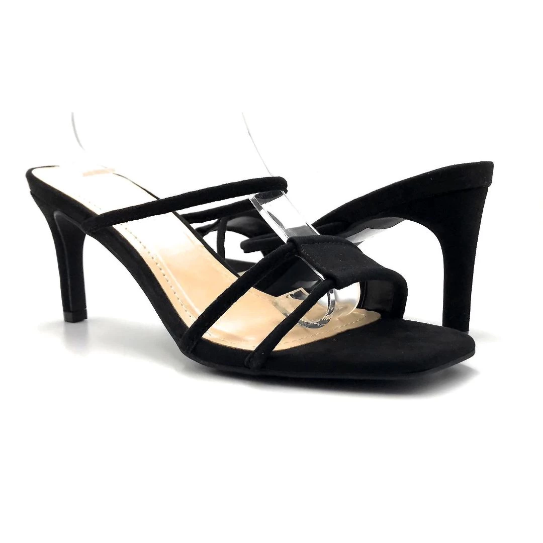 - These Heels features a square open toe silhouette, double band vamp, stiletto heel, slip-on style, and finished with a lightly cushioned insole.
