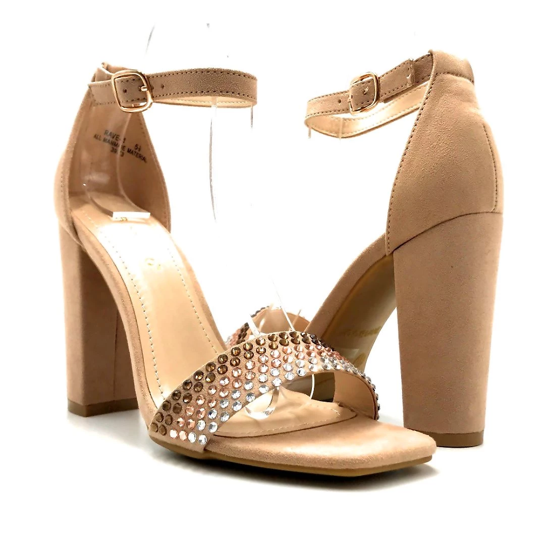 - These sandals features pointed open toe, rhinestone crystal foot strap, two piece construction, thin adjustable ankle strap, thin stiletto high heel.