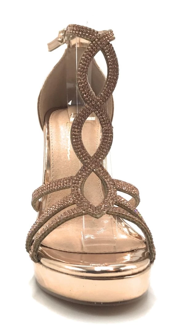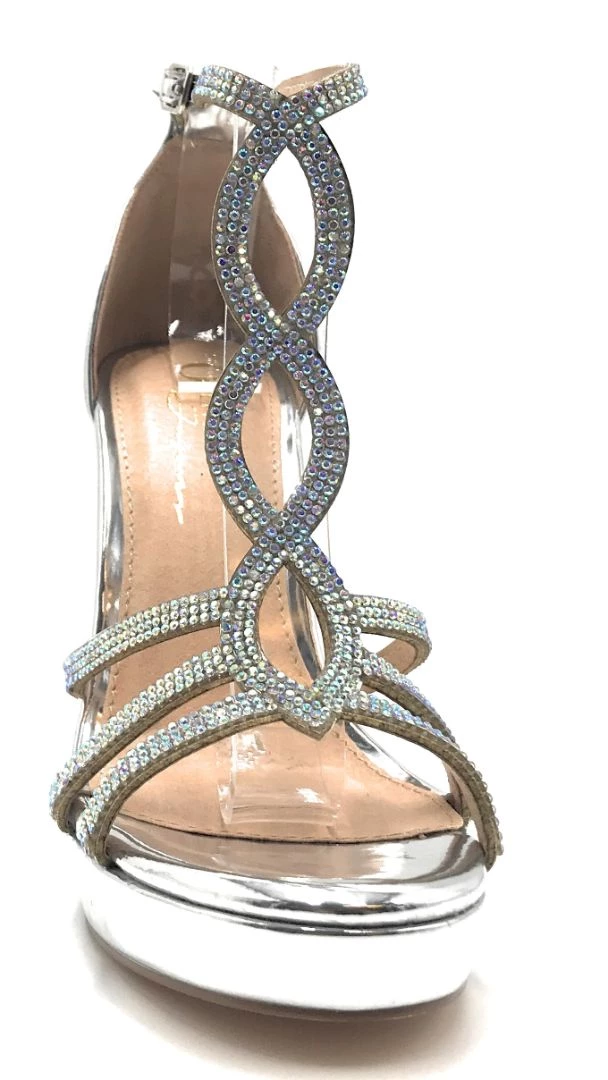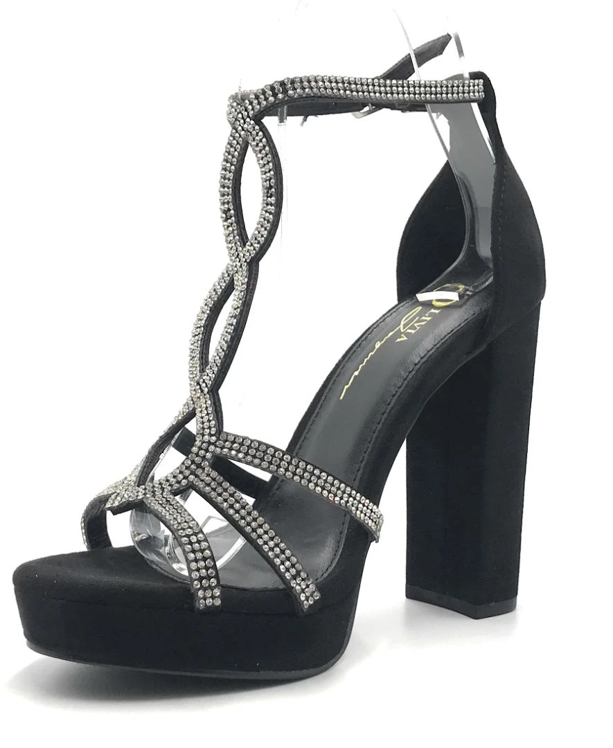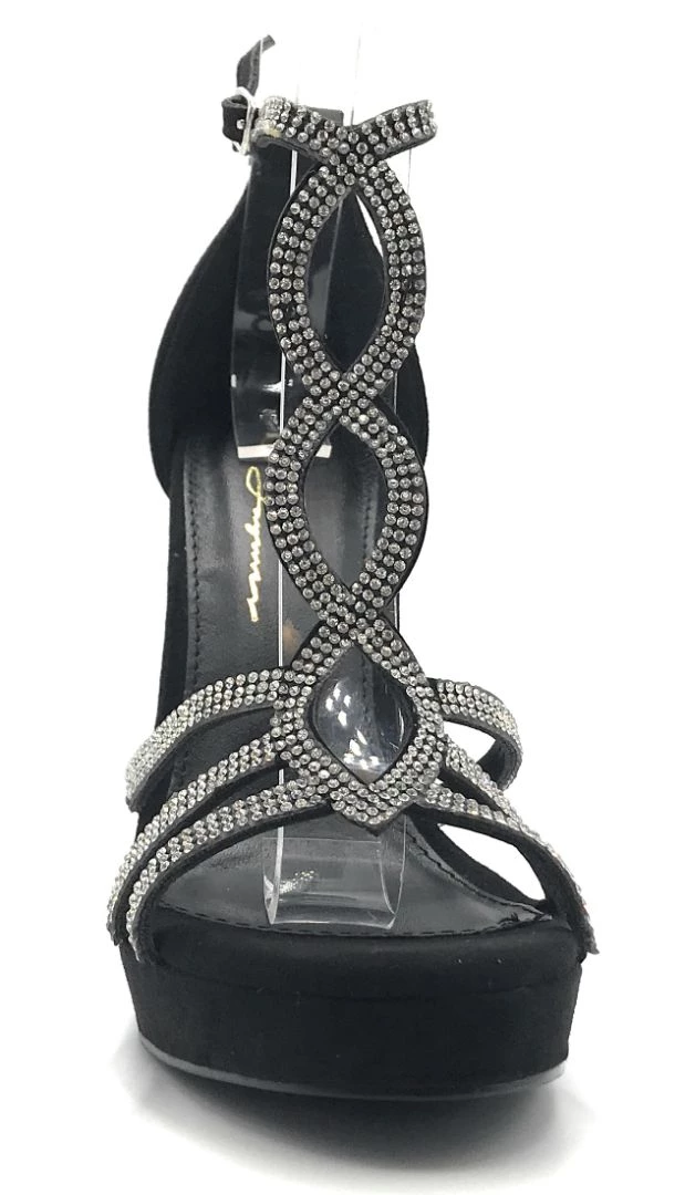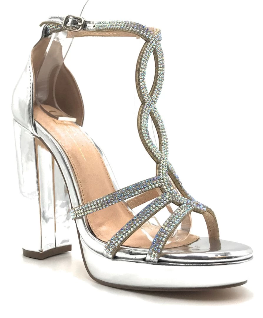 - These Sandals Feature a High Heel, A Lightly Cushioned Insole And a open toe design. The bands over the foot are covered entirely in tiny, evenly spaced rhinestones