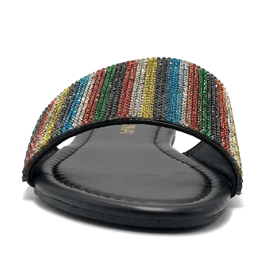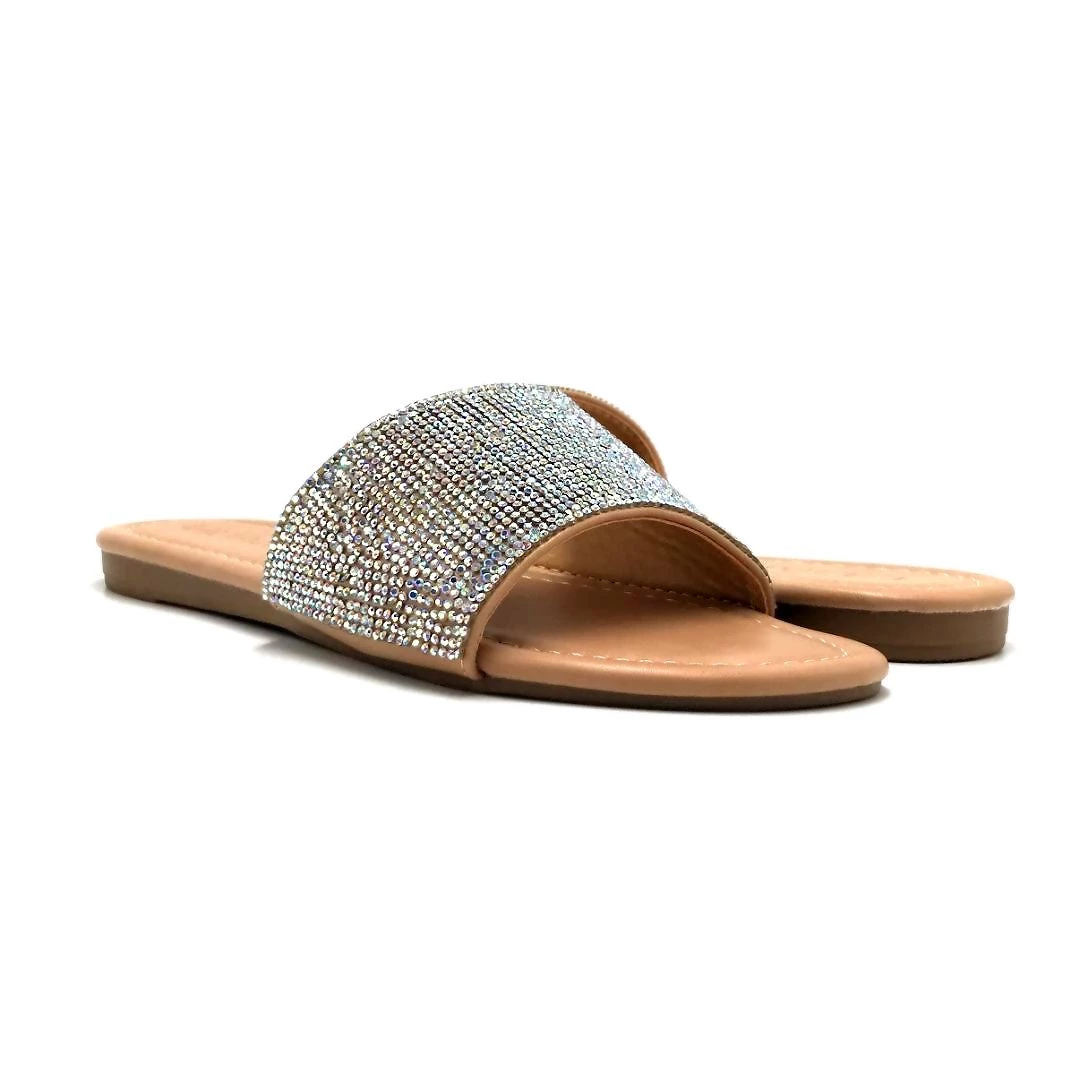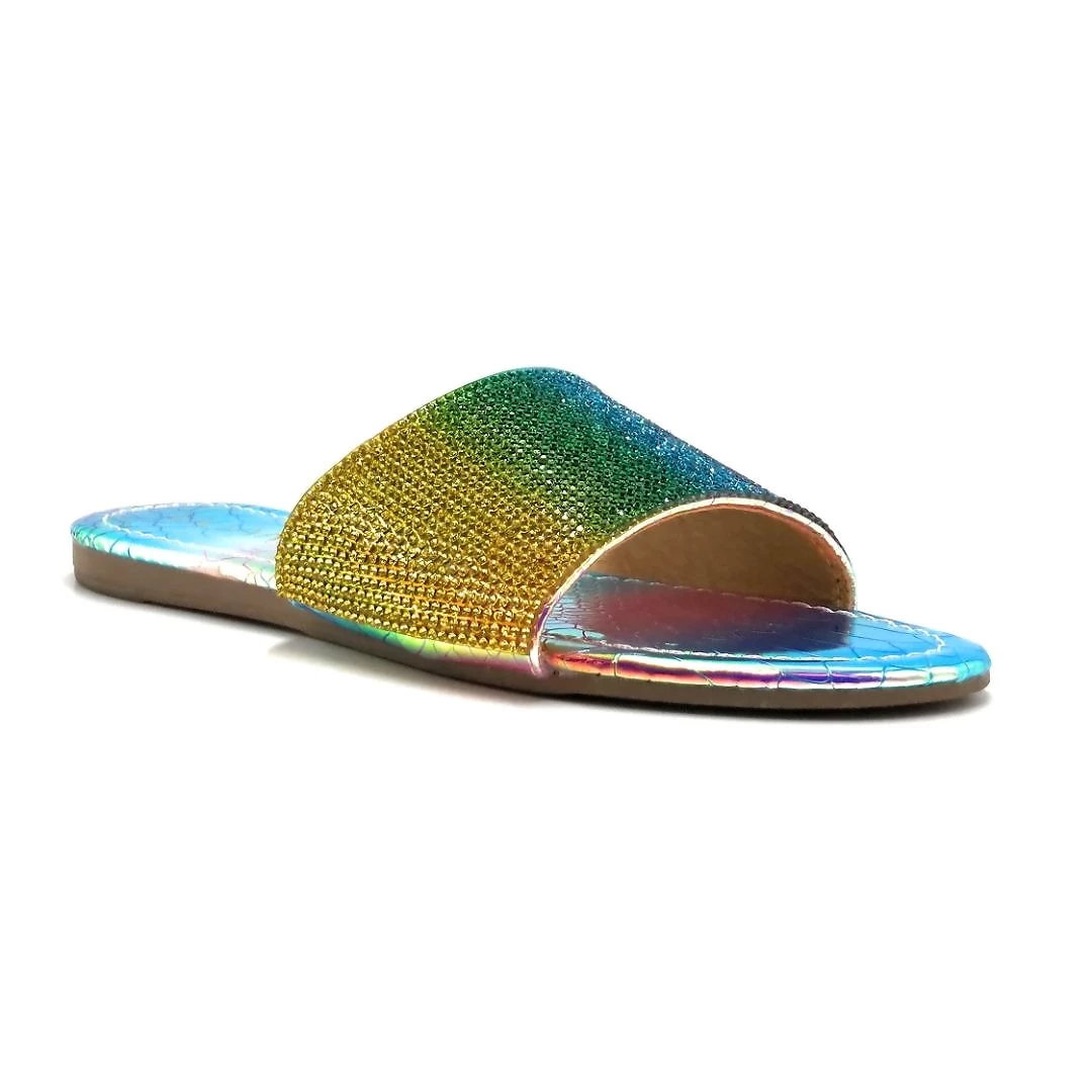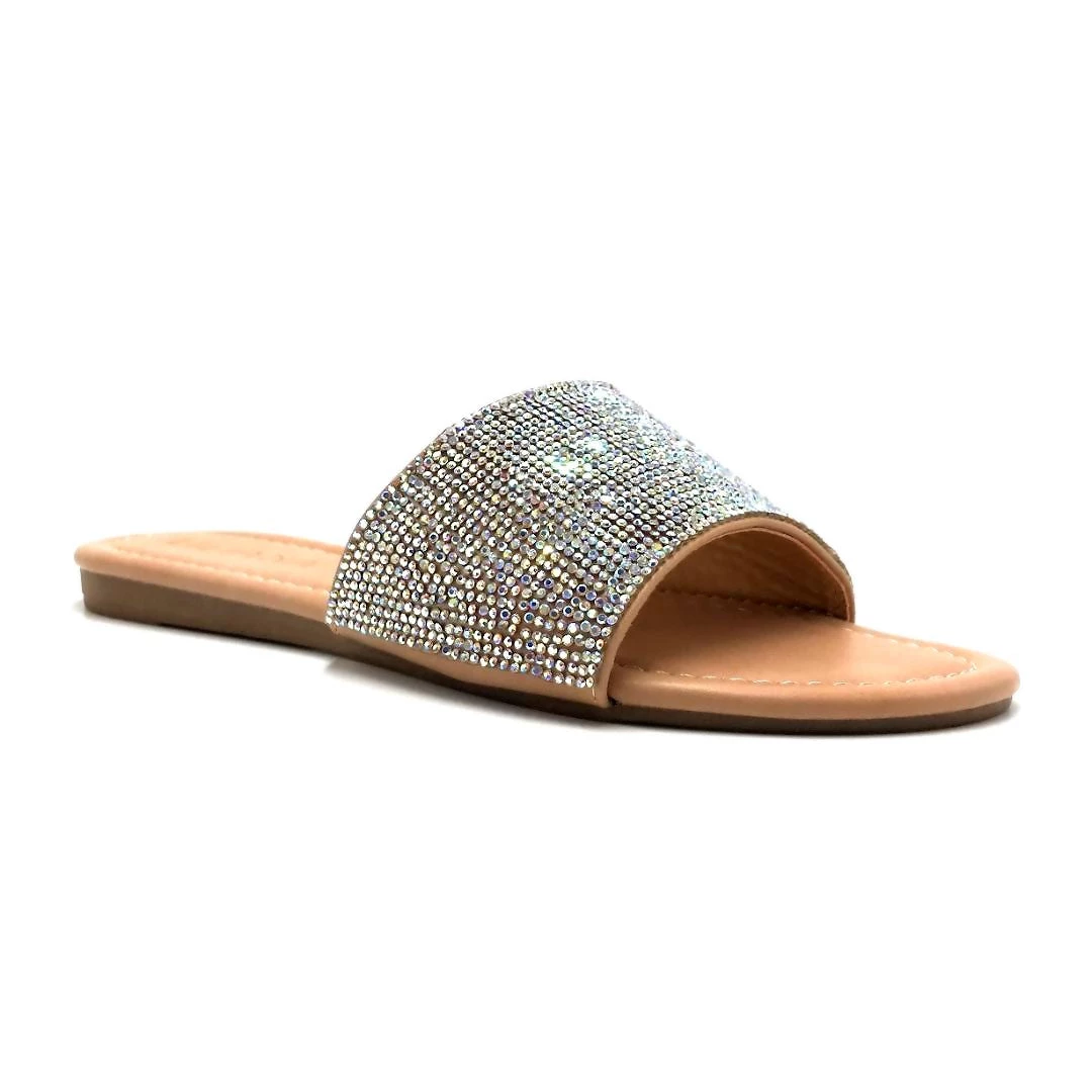 - Low flat slides sandals with glittering rhinestone embellishments, these are exquisite workmanship