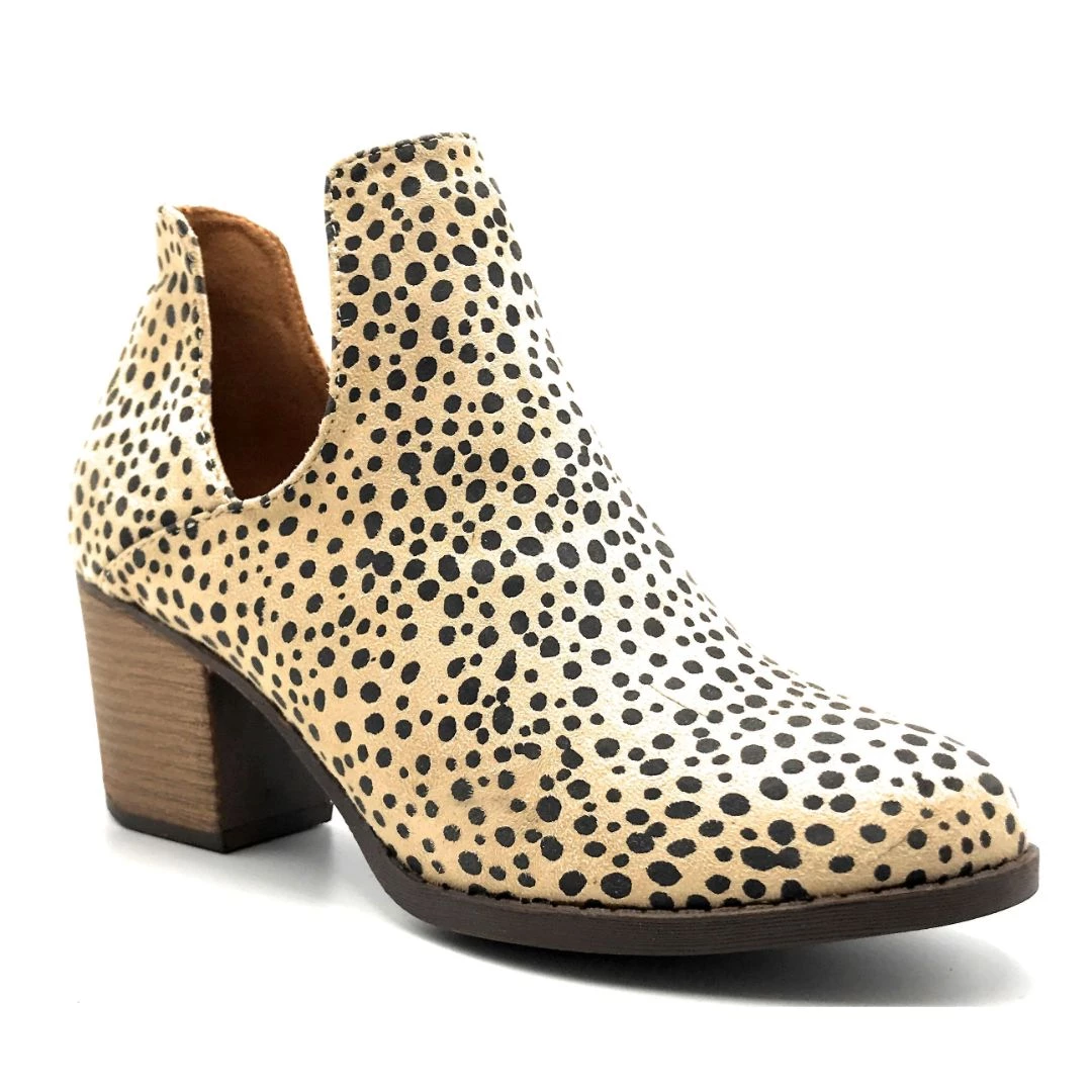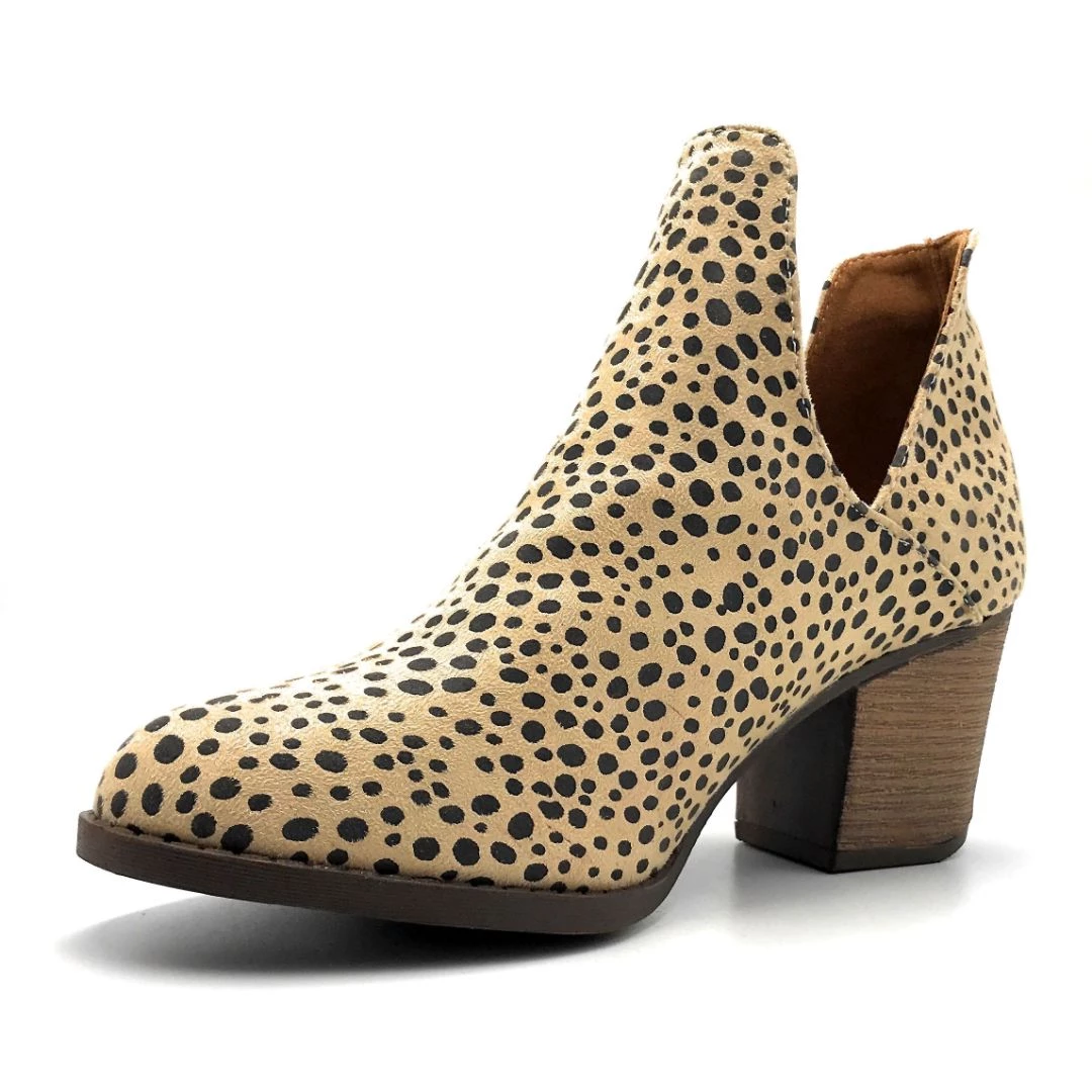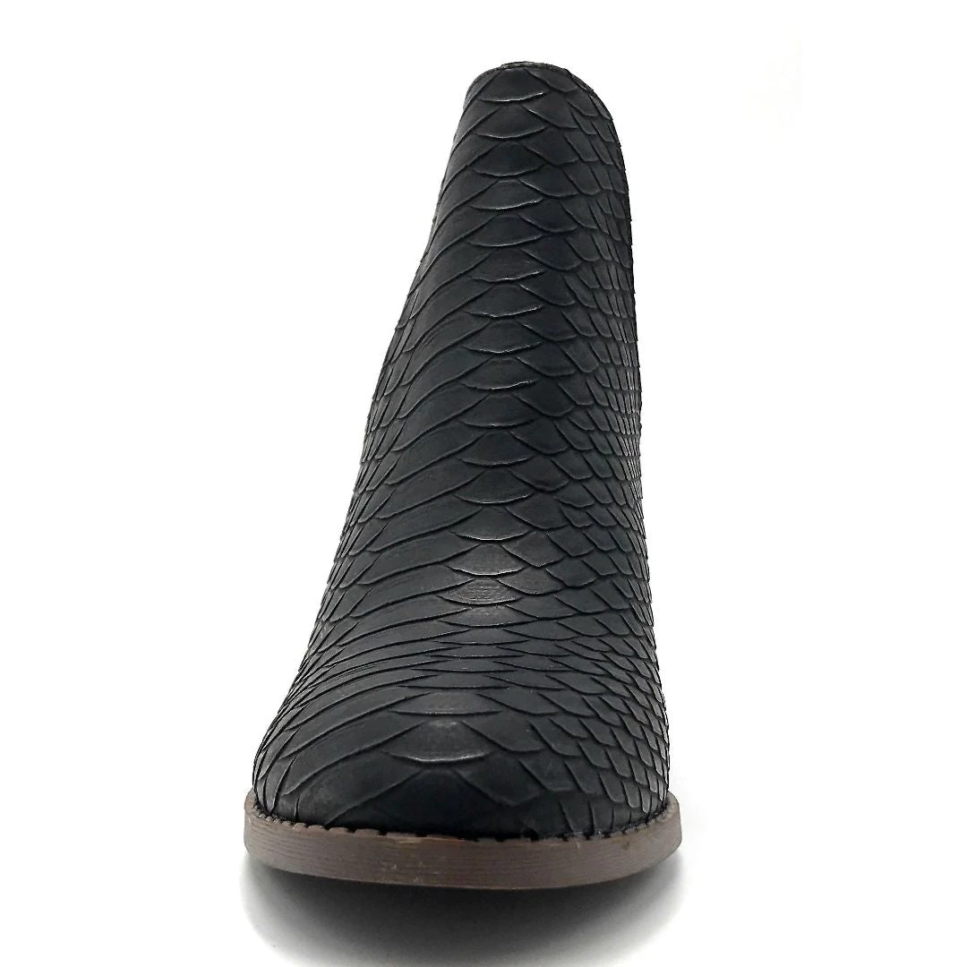 - Shake up your usual style with these funky booties! Designed with faux leather, these booties feature a gorgeous minimalist snake print design. They also feature an approx. 3″ stacked heel to give you a little sass and a stylish rounded toe.