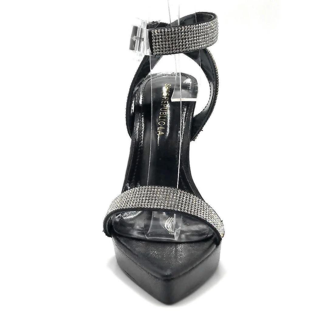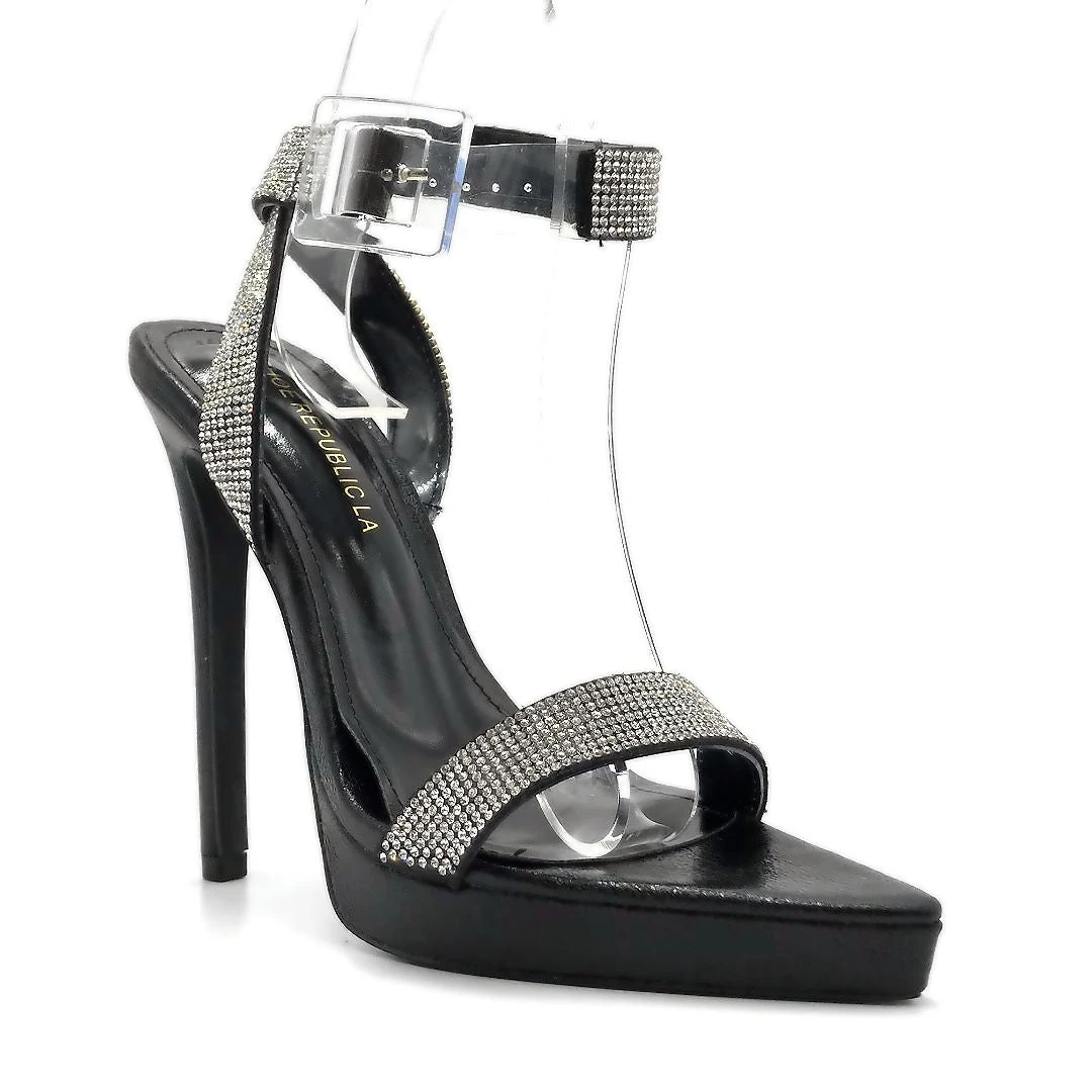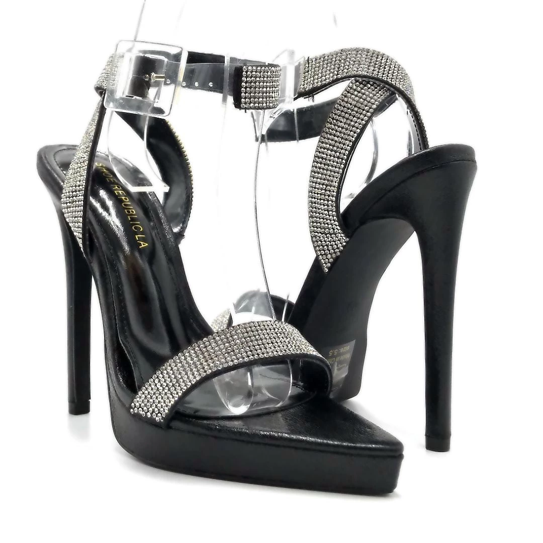 - Features a pointed open toe paired with an uncovered back Rhinestone embellished toe strap and back cross ankle strap A low platform sole and tall stiletto heel.