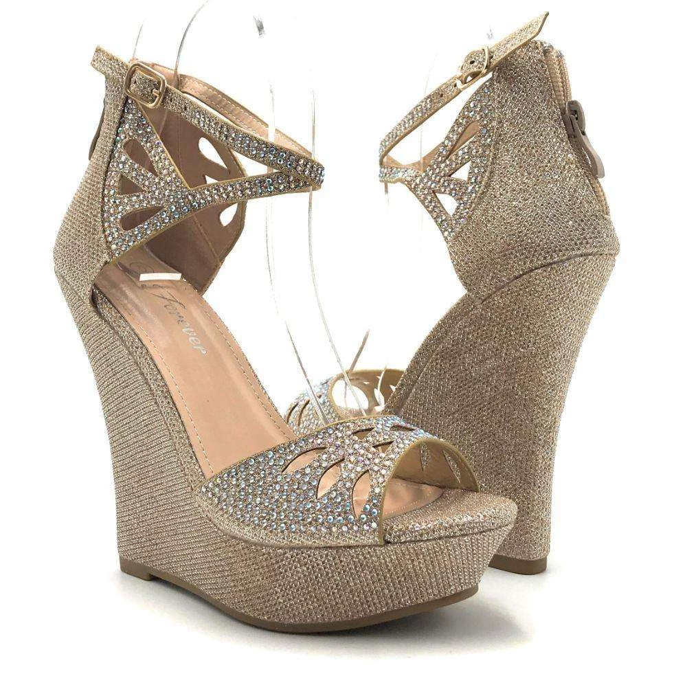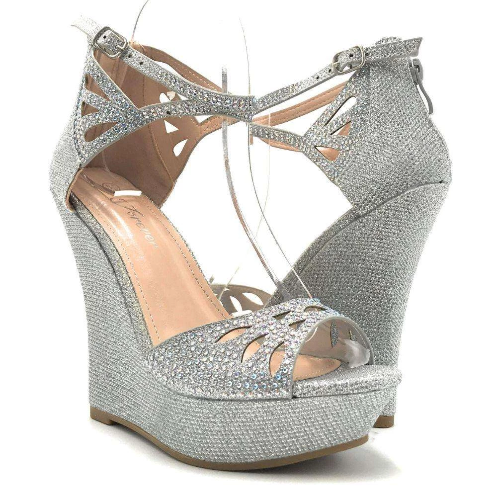 Forever Glittery Rhinestone Women’s Open Toe Platform High Heel Adjustable Buckle Strap Wedge Sandal Back Zipper Closure